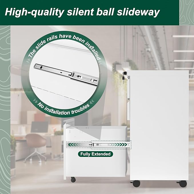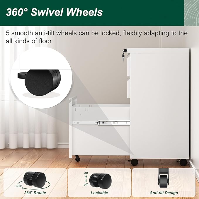 • ❤Mobile File Cabinet -- This mobile filing cabinet is equipped with five rubber wheels, so you don't have to worry about the wheels scratching the floor. In particular, the front central caster to prevent tipping over. And four of the wheels can rotate 360 degrees for stability.