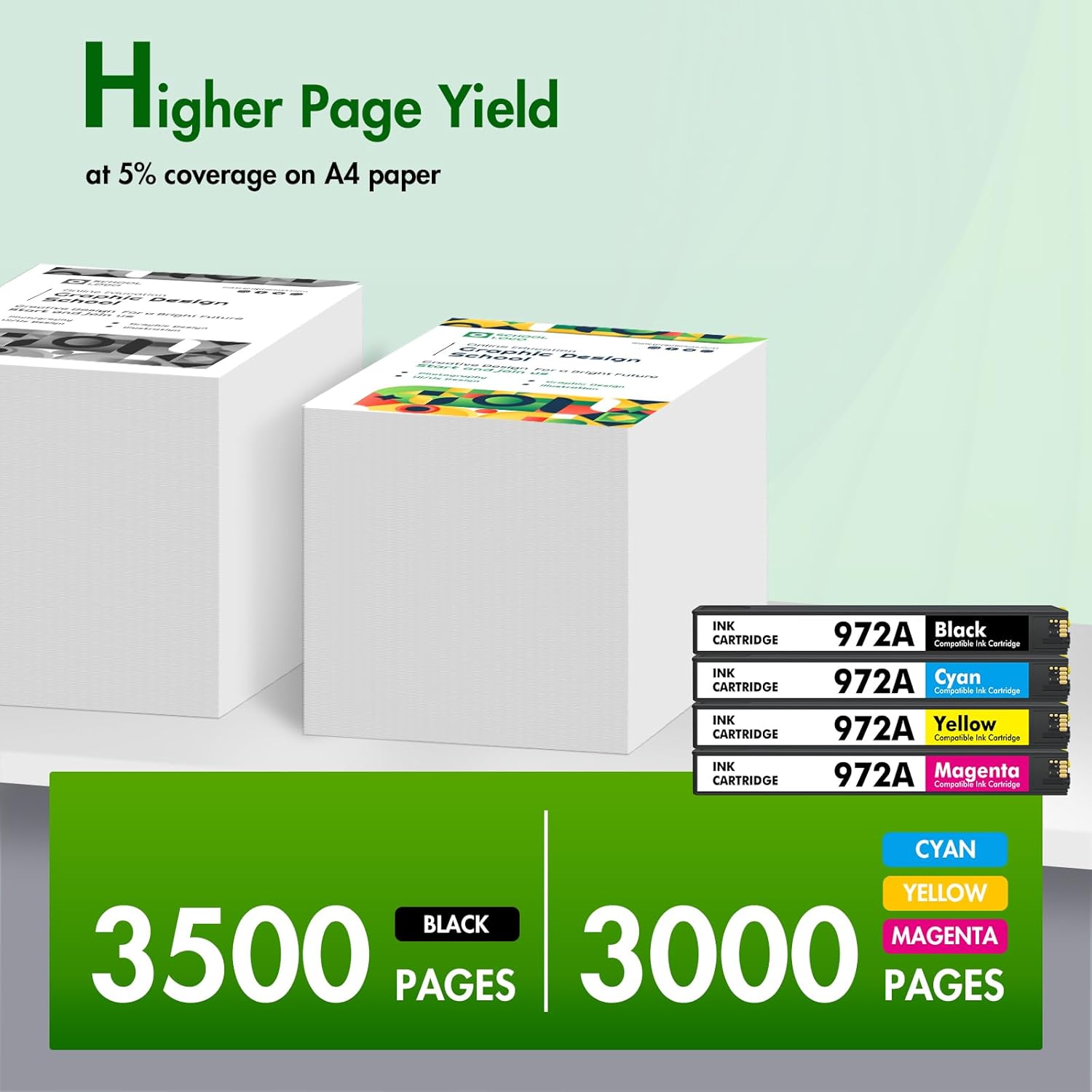 • High Page Yield: Up to 3,500 pages per 972A Black Ink Cartridge, up to 3,000 pages per 972A Color Ink Cartridges (5% coverage at A4 paper)