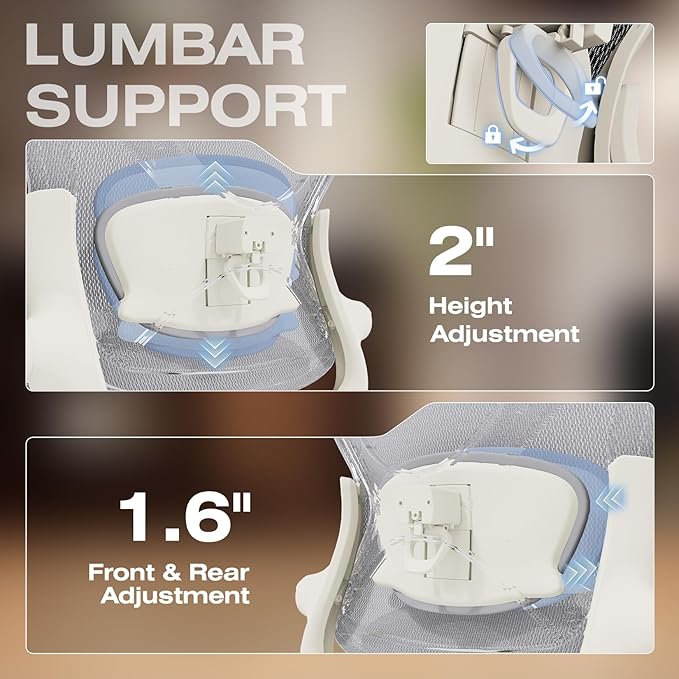 • 【Engineered with Dynamic Spinal Alignment System】3D Synchro-Tilt Lumbar(Lockable ±1.6" depth spring-loaded auto-tracking/±2" height/15° rotation)with force-sensitive springs mimics natural spine curvature, certified by AEP* for 12hrs+ fatigue reduction in ergonomic chairs (*American Ergonomics Partnership)