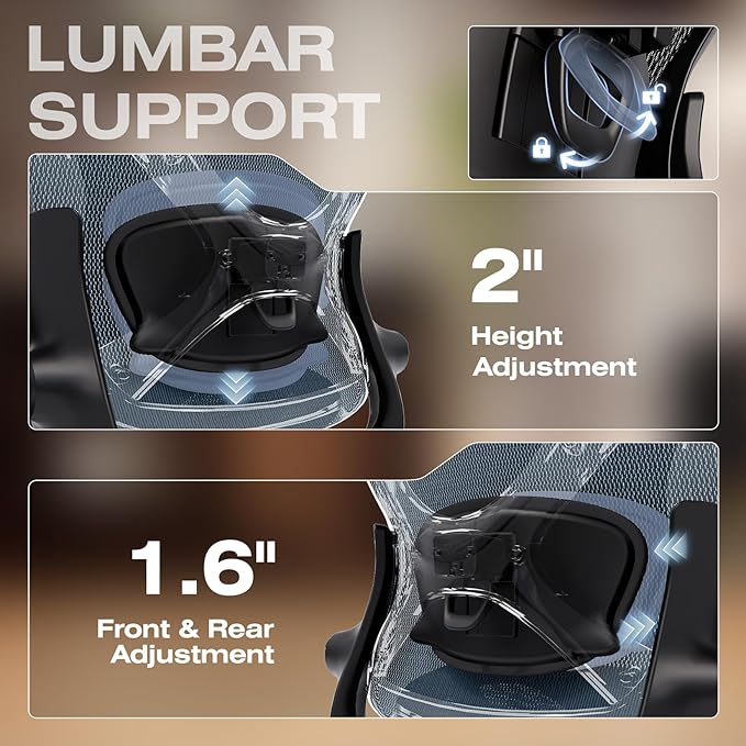 • 【Engineered with Dynamic Spinal Alignment System】3D Synchro-Tilt Lumbar(Lockable ±1.6" depth spring-loaded auto-tracking/±2" height/15° rotation)with force-sensitive springs mimics natural spine curvature, certified by AEP* for 12hrs+ fatigue reduction in ergonomic chairs (*American Ergonomics Partnership)