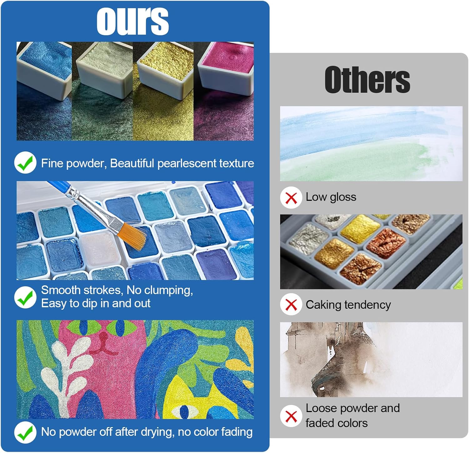 • 【Smooth Strokes, No Powder Off】Our watercolors paint set are extremely durability. Glitter watercolor remain highly stable, drying without crumbling or fading, making the watercolor painting shine forever. The fine powder texture makes the strokes of the pearl paint smooth and resists clumping