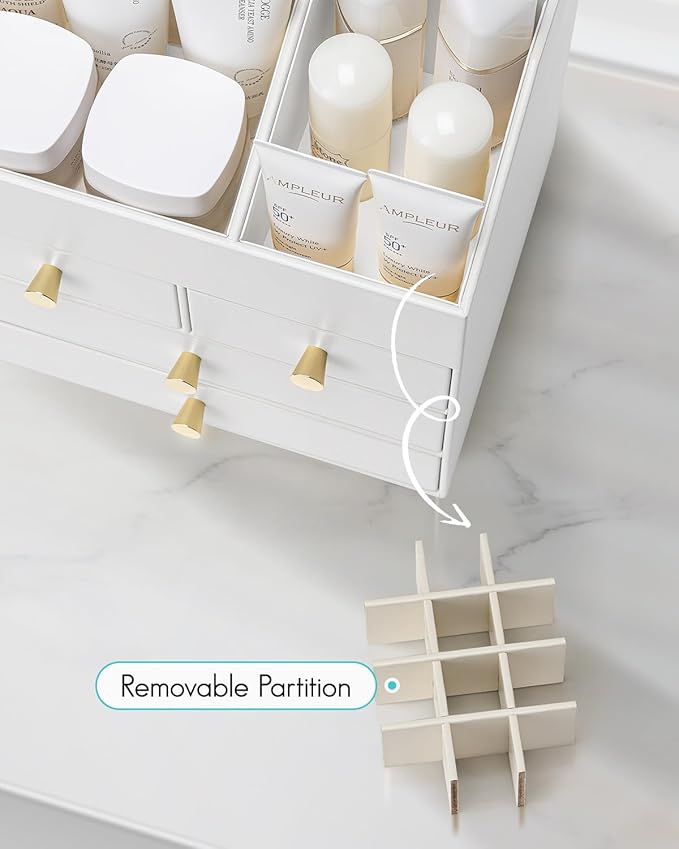 Vlando Makeup Organizer Countertop,Large Vanity Organizer PU Leather Make up Storage with 4 Drawers Skin care Organizer Cosmetic Display Case for Lipstick,Brushes,Bedroom-White