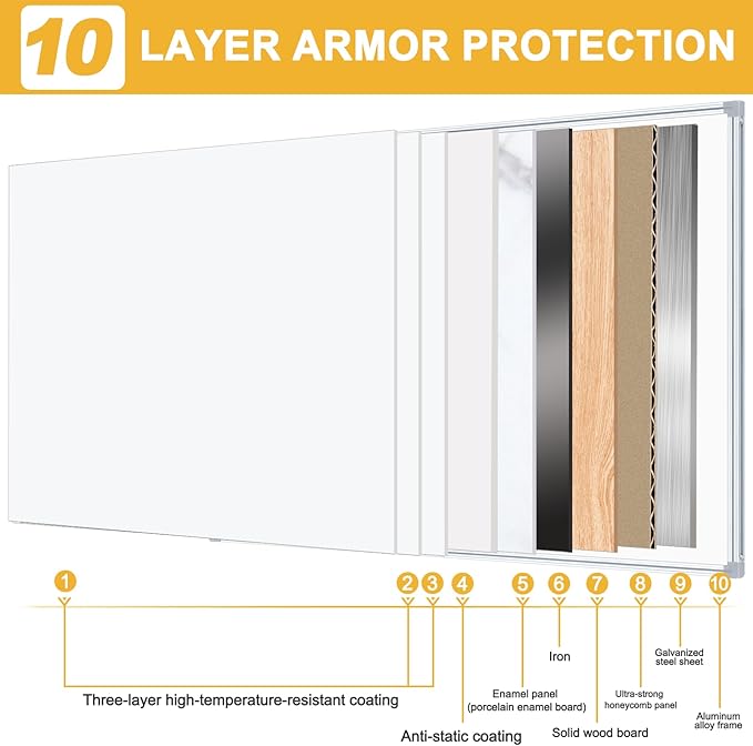 • ✔️ Luxury Belgian Enamel Surface - The 8’x4’ magnetic dry erase board made of imported high-gloss porcelain steel delivers ultra-smooth writing, effortless wiping, and ZERO ghosting even after years of heavy use. Also, This whiteboard is both waterproof and fireproof, and it’s very eco-friendly.