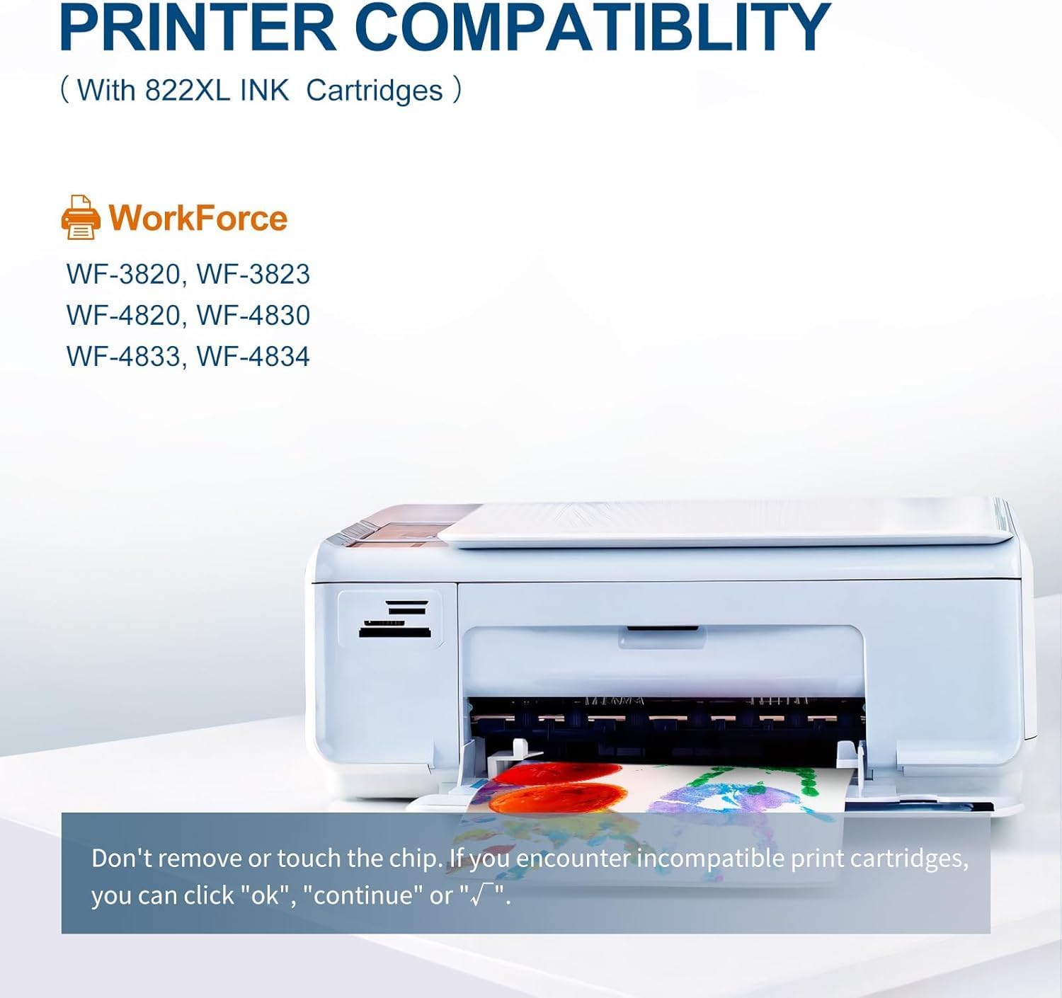 • ♥ Printer Compatibility for epn 822 ink: The 822XL ink cartridges are compatible with Epson WorkForce Pro WF-3820, WF-3823, WF-4820, WF-4830, WF-4833,WF-4834 Printers
