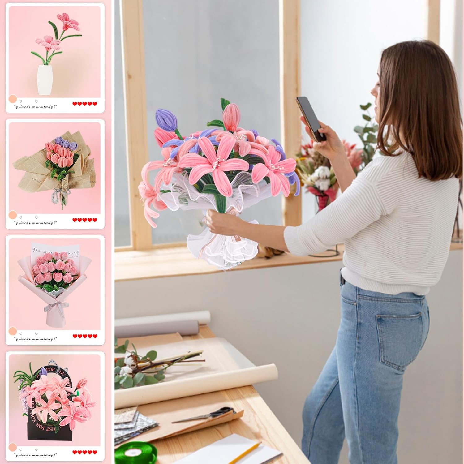• 🌸 4 Themed SKUs: Choose from Sunflower, Rose, Daisy, or Lily bundles—each with 4-5 coordinated colors to craft a full bouquet.Our flower varieties will continue to be updated, so stay tuned.