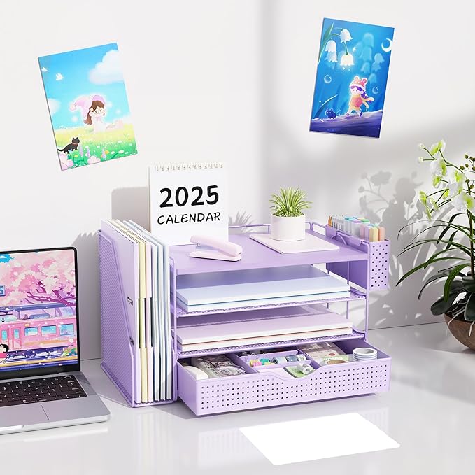 Wood Desk Organizers and Accessories with File Holder, 4-Tier Desk Accessories & Workspace Organizers with Drawer and Pen Holder, Paper Organizer for Office Supplies (Purple)