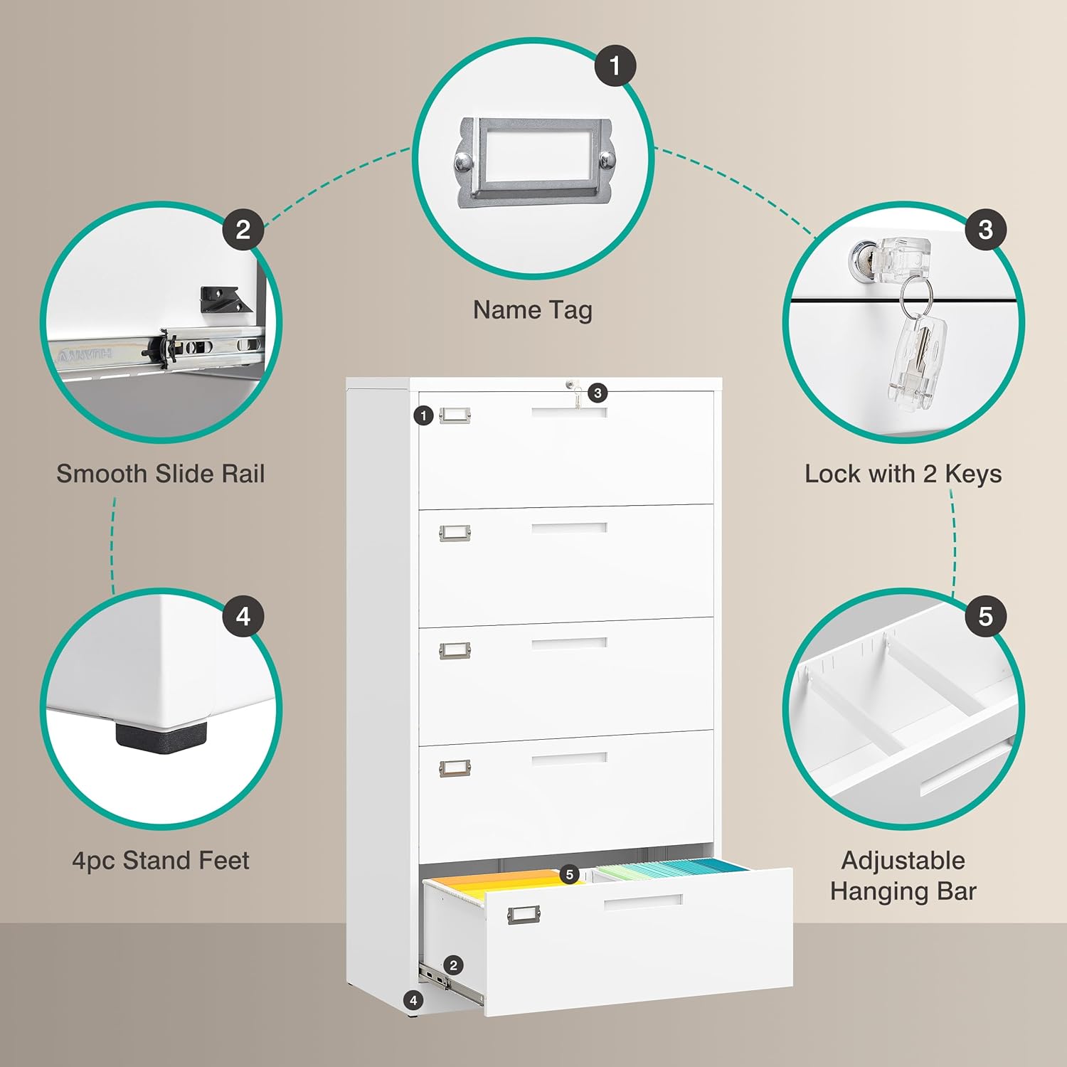 SISESOL 5 Drawer Lateral File Cabinet with Lock,White Lateral Filing Cabinet,Horizontal Metal Filing Cabinets,Large Locked Wide Five Drawer File Cabinets for Office Home,Fit A4/F4/Letter/Legal File