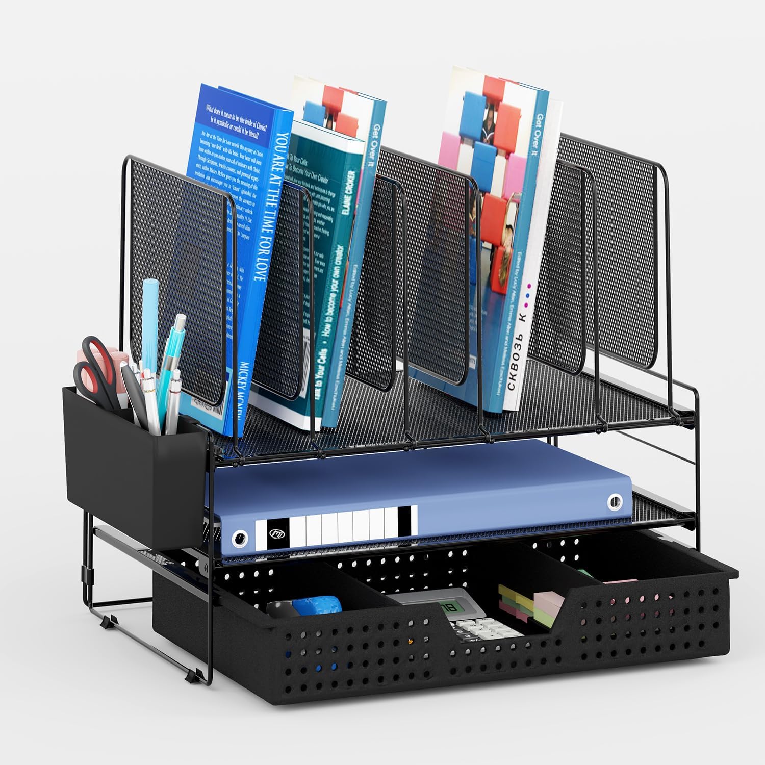 Desk Organizer, Office Organization with Vertical File Holder, File Organizer with Drawer and Pen Holder, Desk Accessories and Workspace Organizers for Home Office (Black)