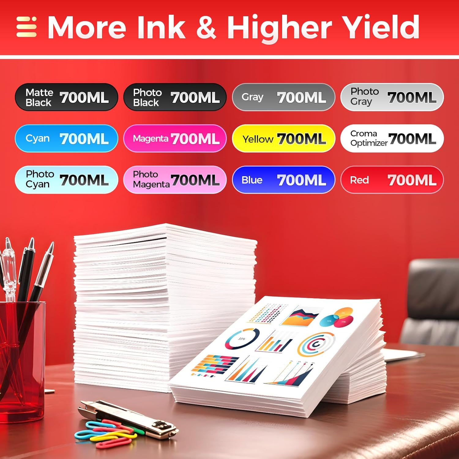 • Ink Volume: The capacity is 700ML per ink cartridges, Total ink volume is 8400ml,