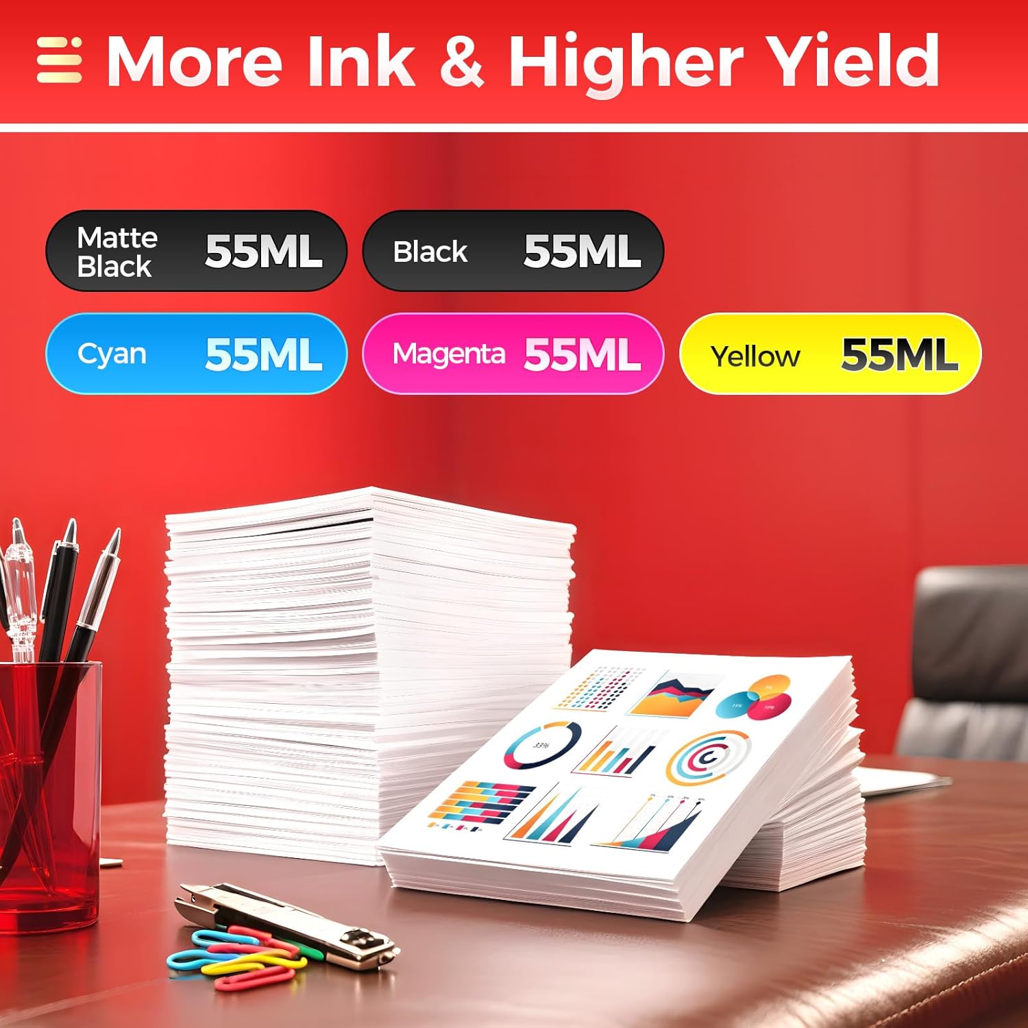 • Ink Volume: The capacity is 55ML per ink cartridges, Total ink volume is 275ml.