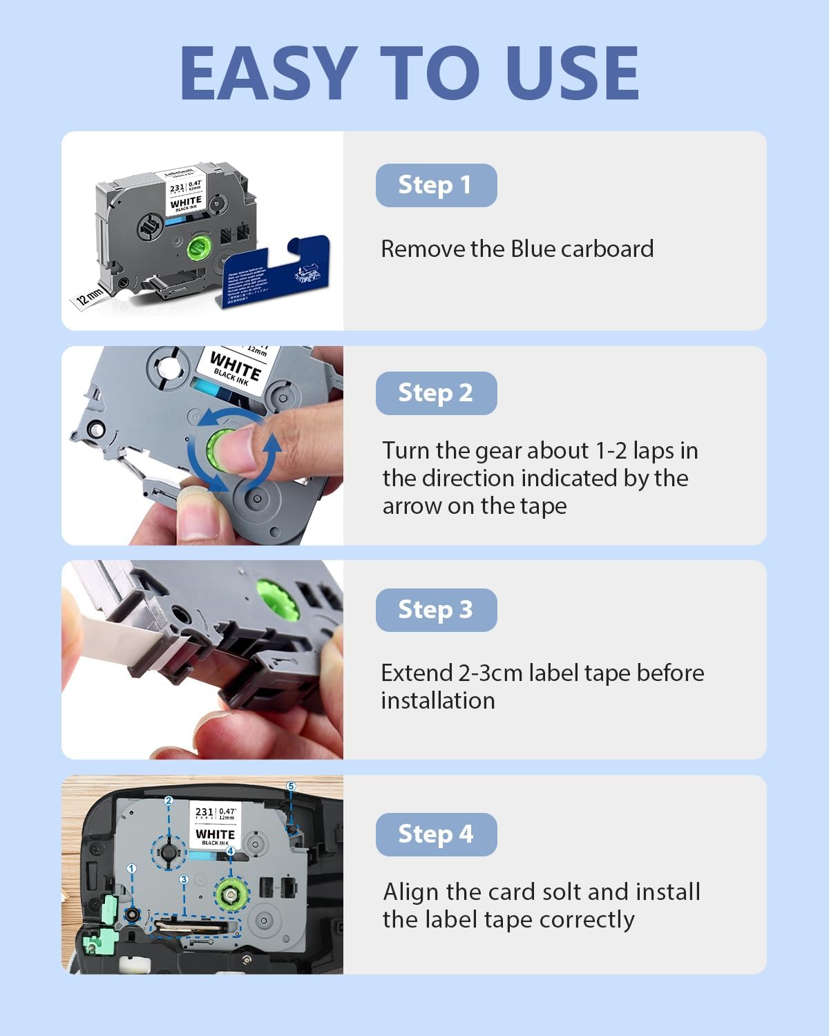 • What's Included: 6-Pack Compatible for Brother Label Maker Tape TZe TZ Tape 12mm 0.47 Laminted Black Ink on White Tape, Replacement for TZe-231 TZe231 TZ-231 Label Tape