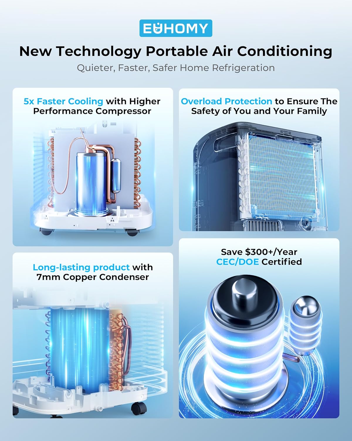 • 🍃【Deep, Refreshing Comfort & Superior Airflow】 Immerse yourself in continuous, refreshing coolness. The EUHOMY air conditioner portable generates a powerful stream of fresh, cool air that reaches even the farthest corners of your room. It maintains a consistently lower temperature for ultimate comfort, making this small air conditioner ideal for beating the heat anywhere.