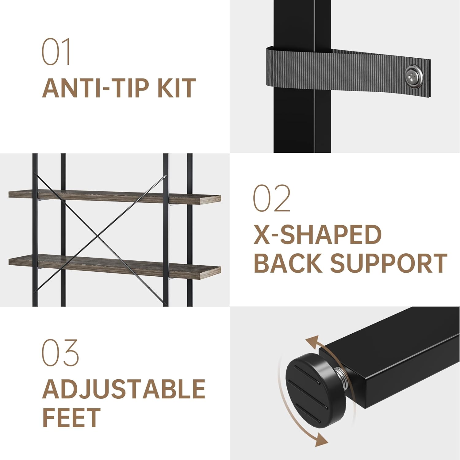 • Stable and Durable: Our four-tier industrial bookshelf is capable of holding heavy items securely. The matte black steel frame includes X-shaped support, adjustable feet, and two anti-tip devices, ensuring enhanced stability and durability