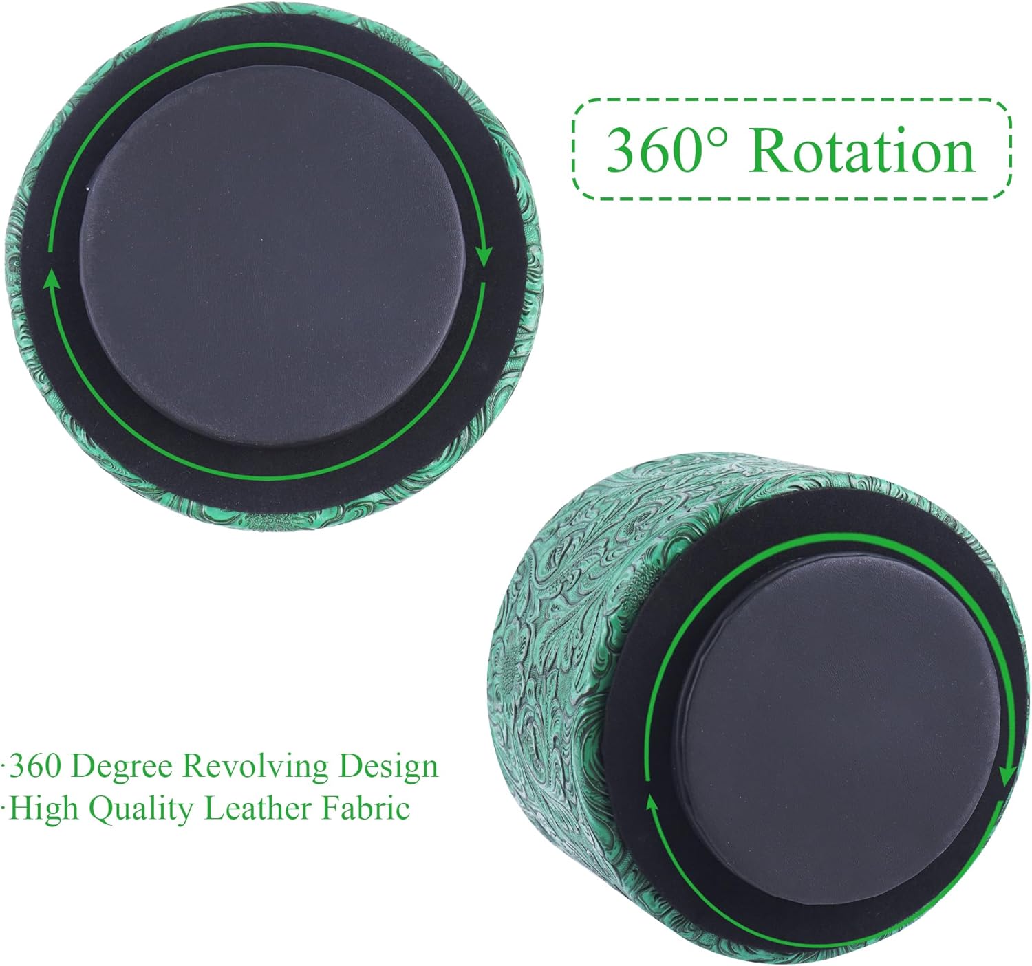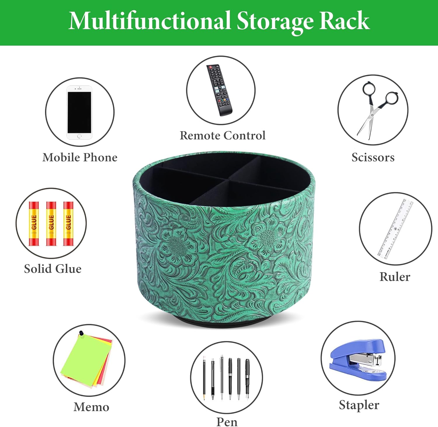 lizimandu Round Leather Art Supply Organizer,Remote Control Holder,360 Degree Spinning,Multi-Functional Pencil Holder,4 Compartments Desktop Stationary Organizer(1-Carved Green)