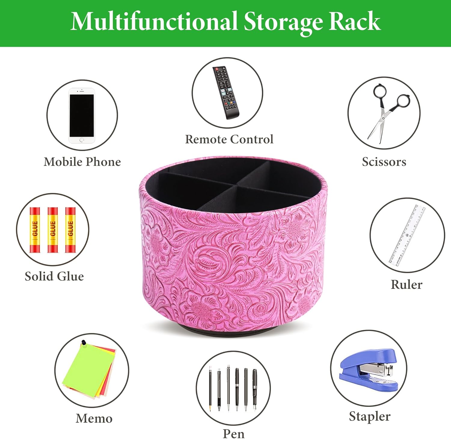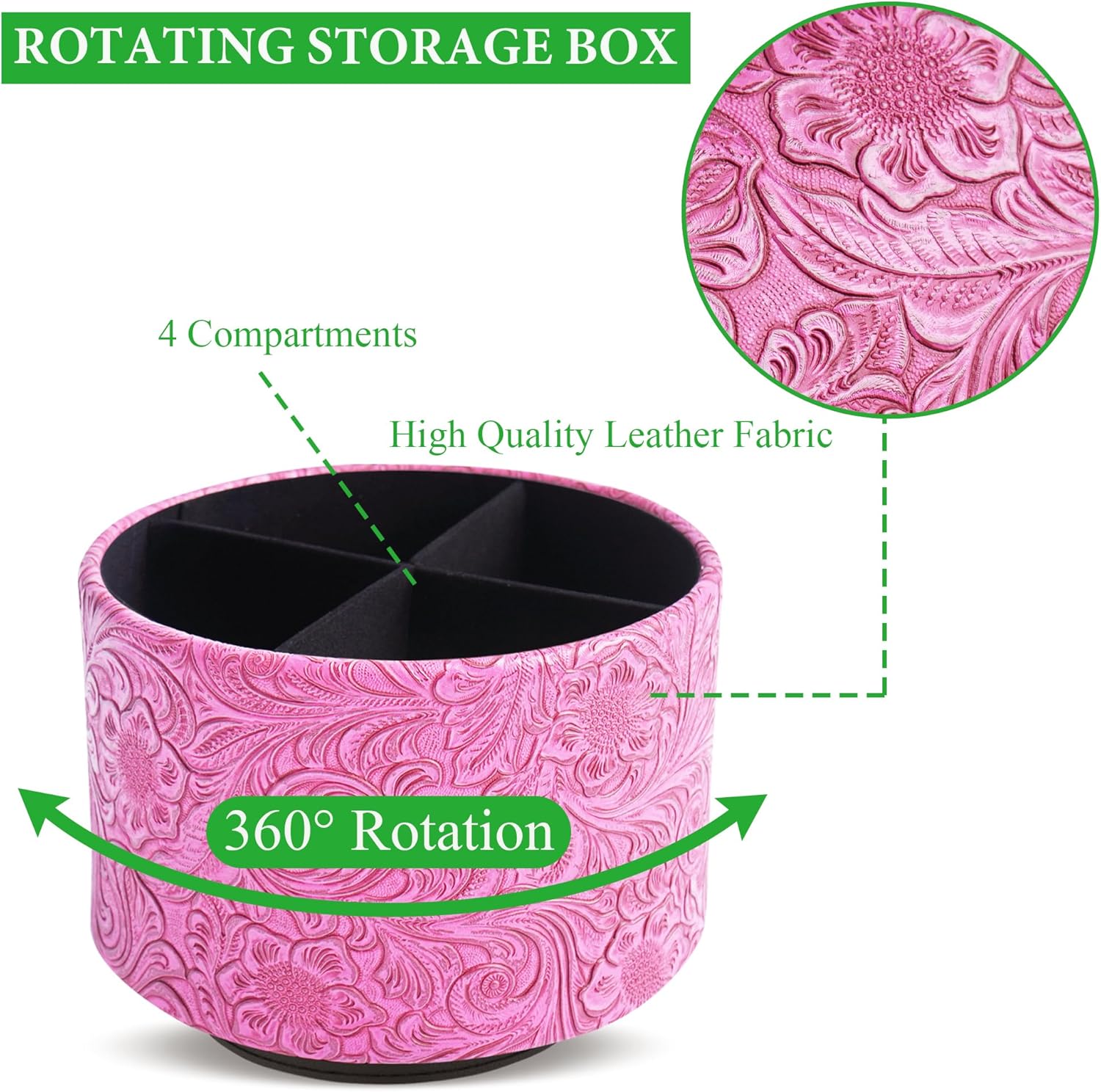 lizimandu Round Leather Art Supply Organizer,Remote Control Holder,360 Degree Spinning,Multi-Functional Pencil Holder,4 Compartments Desktop Stationary Organizer(1-Carved Red2)