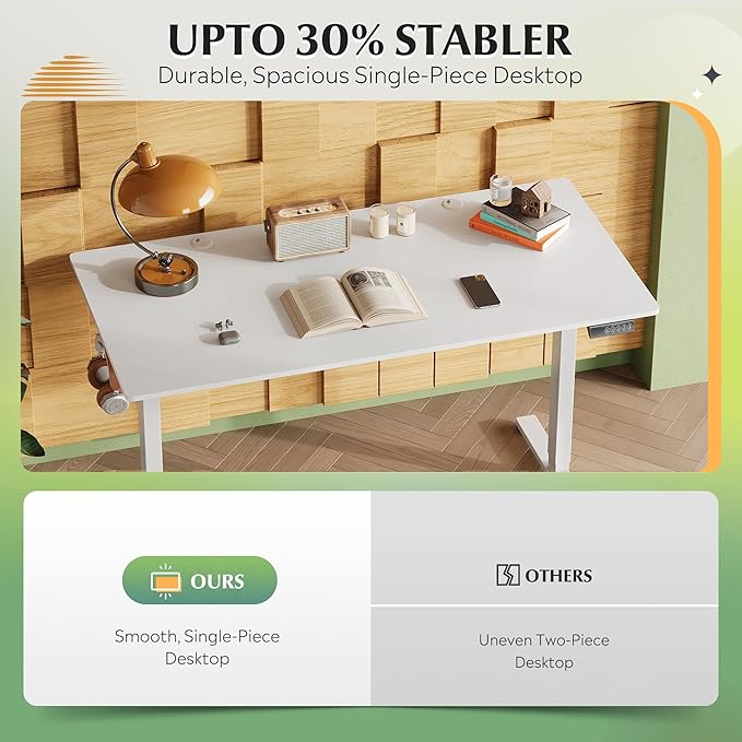 • Seamless One-Piece Desktop: Our stand up desk features a smooth, one-piece desk surface without visible seams. Unlike other models with joined panels, this seamless design offers 30% enhanced stability to provide a solid foundation for your equipment.