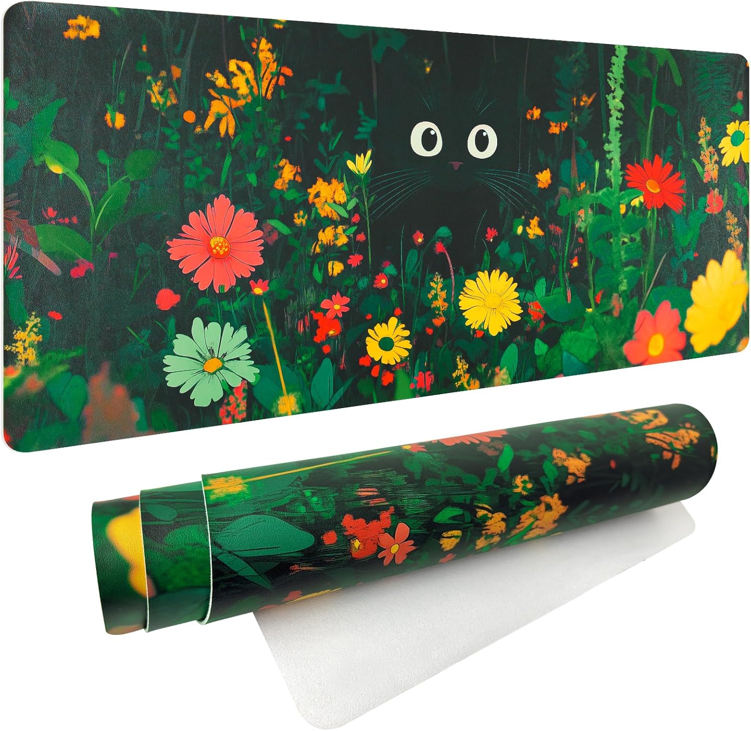 Bloss Wildflowers Mouse Pad,Large Floral Plants Desk Pads for Desktop,Cute Black Cat Leather Desk Mat for Keyboard and Mouse,Computer Laptop Desk Protector Mat for Office/Home/Women Gift,31.5" x 15.7"