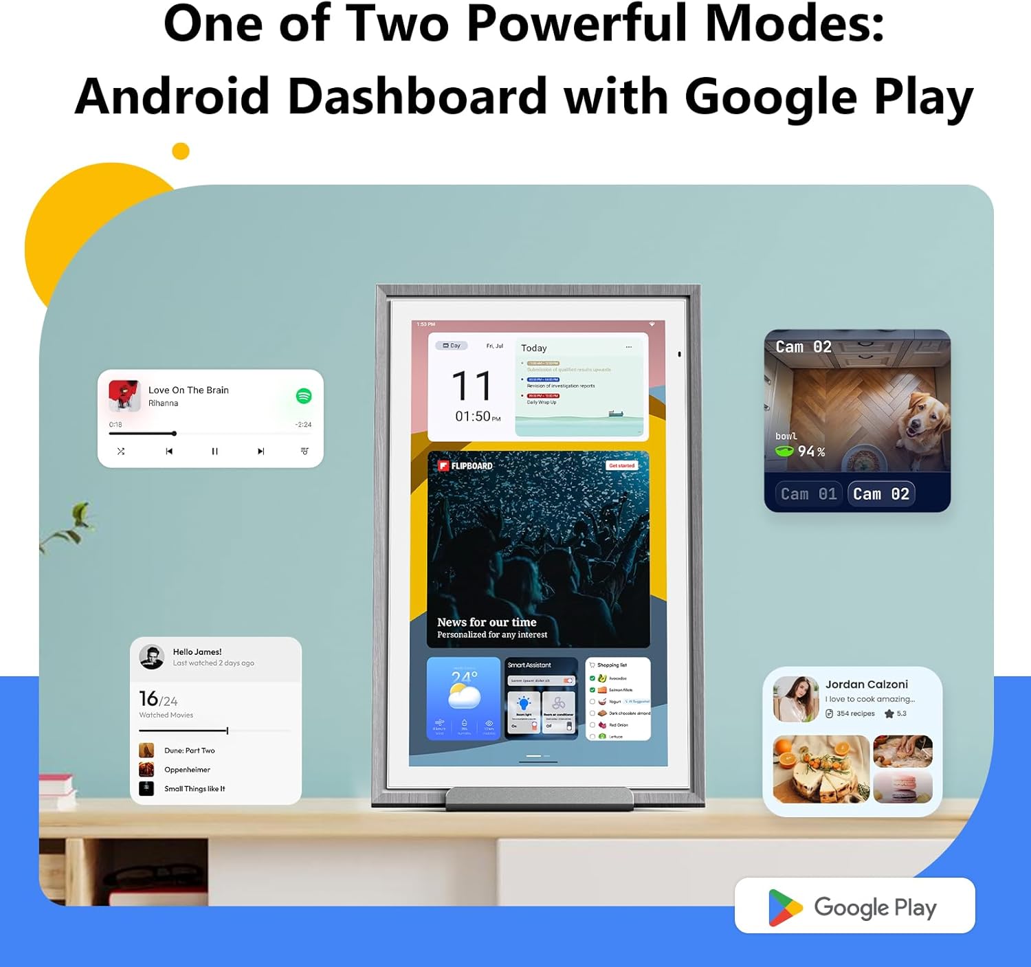 • HD Touchscreen & Smart Memory Frame: Enjoy a vivid HD touchscreen with Incell + AG anti-glare tech for glare-free viewing; elegant wooden frame supports wall or desktop use; auto portrait/landscape rotation; energy-saving sleep mode; transforms into a smart photo frame with Google Photos or direct uploads—no subscriptions needed.