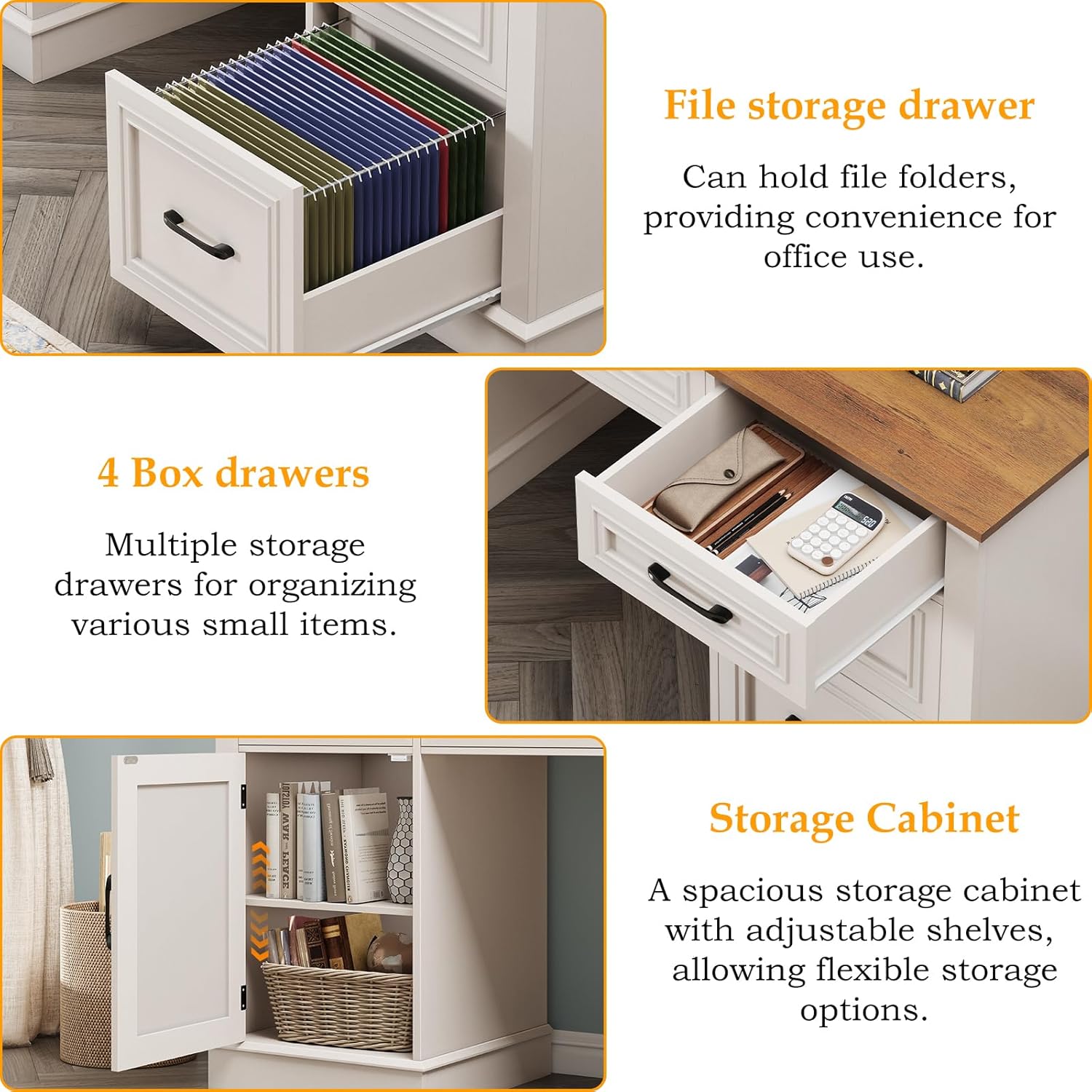 • 【Abundant Storage Capacity】This large executive desk, 61" wide and 67" tall, provides plenty of space for files, computers, and printers. It has five drawers, including dedicated file drawers that can hold both letter and A4-sized documents. There are also roomy storage cabinets, offering an organized way to keep files, books, and other necessities.