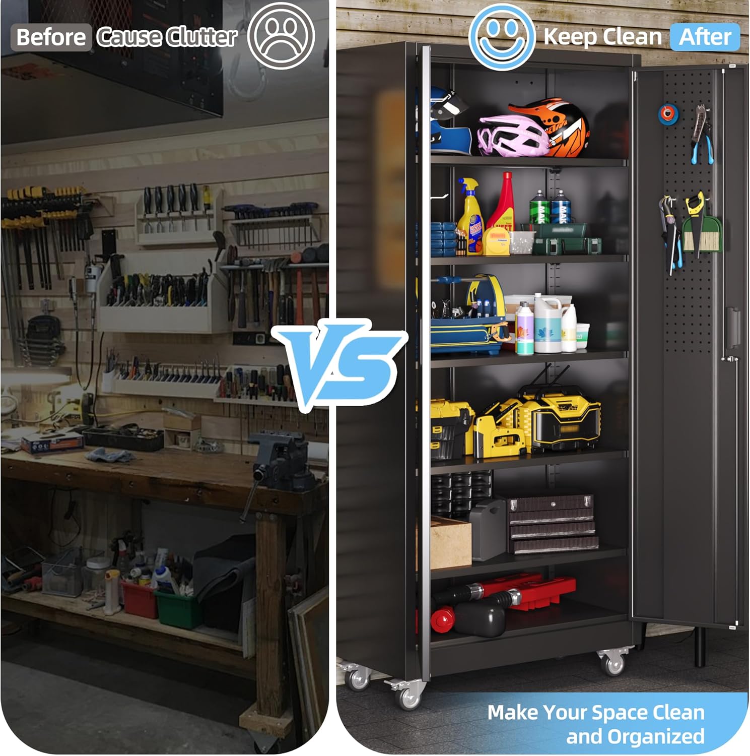 Aobabo Upgraded Garage Storage Cabinets with Wheels,Metal Storage Cabinets with 5 Adjustable Shelves for Garage Home Office Storage, Black,71''H*32''W*16''D,Assembly Required
