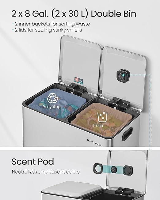 • Ready to Use: This double trash can includes 15 trash bags for immediate use and is compatible with SONGMICS 8-gallon trash bags (code H). The inner bucket features a bag hole to keep liners securely in place