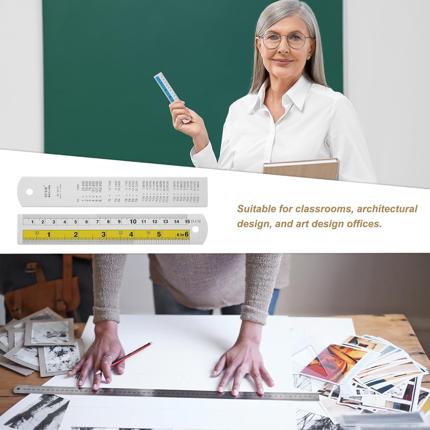 • Application - The dual-scale straight ruler is widely used in geometric drawing, plane drawing, composition planning, and mathematical chart drawing; it is suitable for classrooms, architectural design, art design office occasions, and other work environments that require precise measurement or drawing.