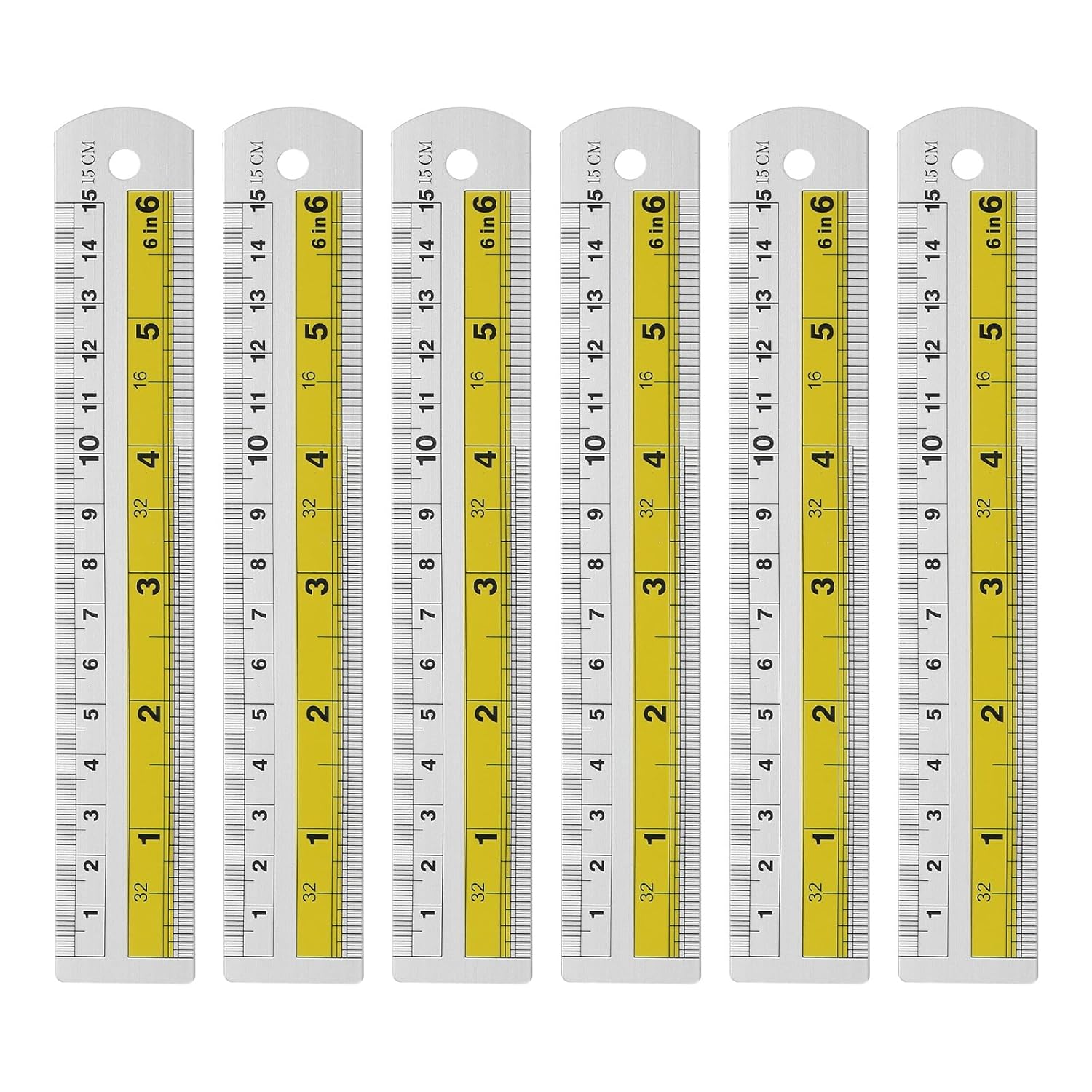HARFINGTON 6pcs Metal Straight Ruler 15cm Metric SAE Aluminum Alloy Measuring Rulers Scale Tool with Hole for Measure Study Reading Classroom Office, Yellow