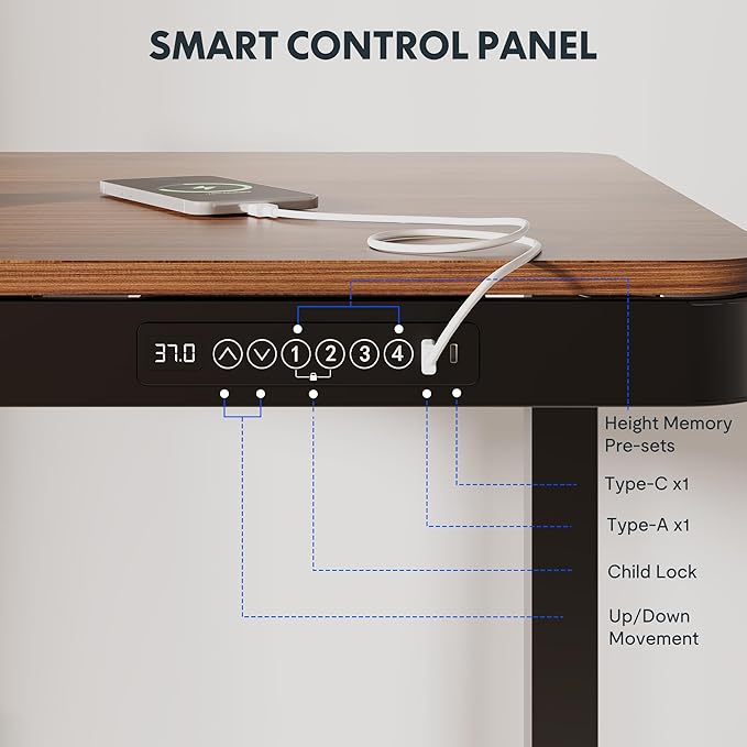 • Embedded Multiple Functions: This standing desk comes with four programmable height presets, making it easy to save your preferred heights. a child lock button helps prevent accidental touch. Charge up to three devices with integrated USB ports without mess & hassle. (Note: USB ports may pause charging while adjusting desk height, Laptop charging is not supported)