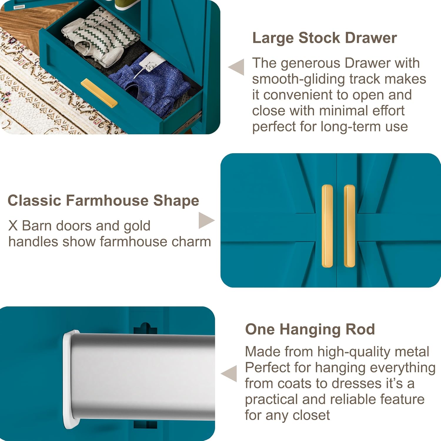• Farmhouse-Style Aesthetic: The door panel of the metal wardrobe closet is designed with a charming farmhouse aesthetic, adding a touch of rustic elegance to your space. Storage cabinet has classic design complements a variety of decor styles, making it a versatile choice for any room