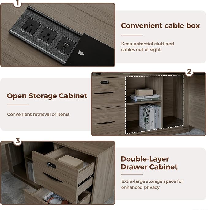 • Secure Storage Solution with Lockable Drawers This executive office desk offers secure storage with integrated lockable drawers, perfect for keeping confidential files, electronics, and personal items protected. The combination of enclosed compartments and open shelving supports an organized workstation, ideal for both home office setups and professional business environments.