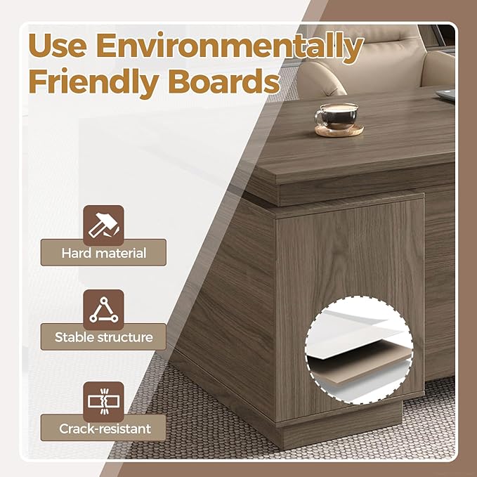 • Reversible Storage Cabinets for Custom Executive Desk Setup This executive office desk features a modular design with reversible storage cabinets that can be installed on either the left or right side. Whether you're setting up a home office or a business workspace, the flexible layout adapts to your room and work style—ideal for both left-handed and right-handed users.