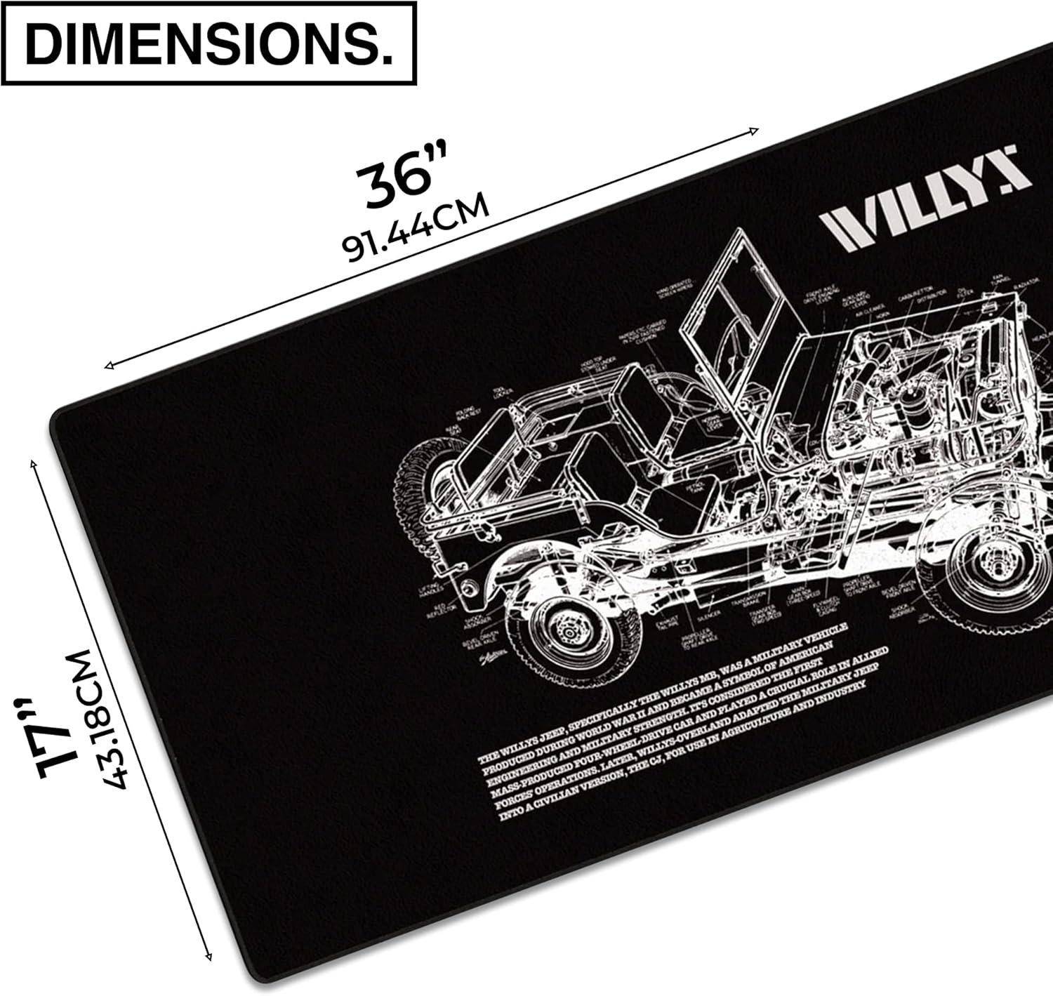 MPCO. Blueprints Large Gaming Desk Pad - 36" x 17" Duraglyde Fabric Willys Jeep – Black Desk Mats - Non-Slip, Washable, Smooth Glide for Precision Gaming & Work