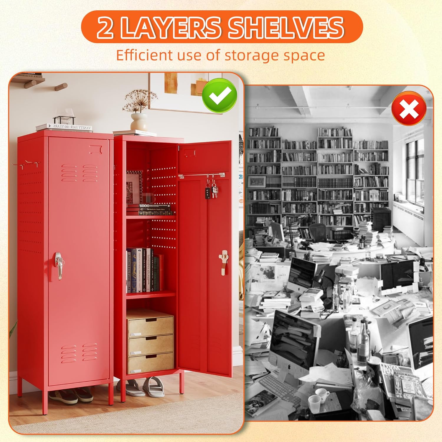 Metal Storage Locker with Pegboard and Hooks,Metal Locker for Employees with Handle and Hanging Rod for Gym, School, Office,Home,Garage,Assembly Required,Red