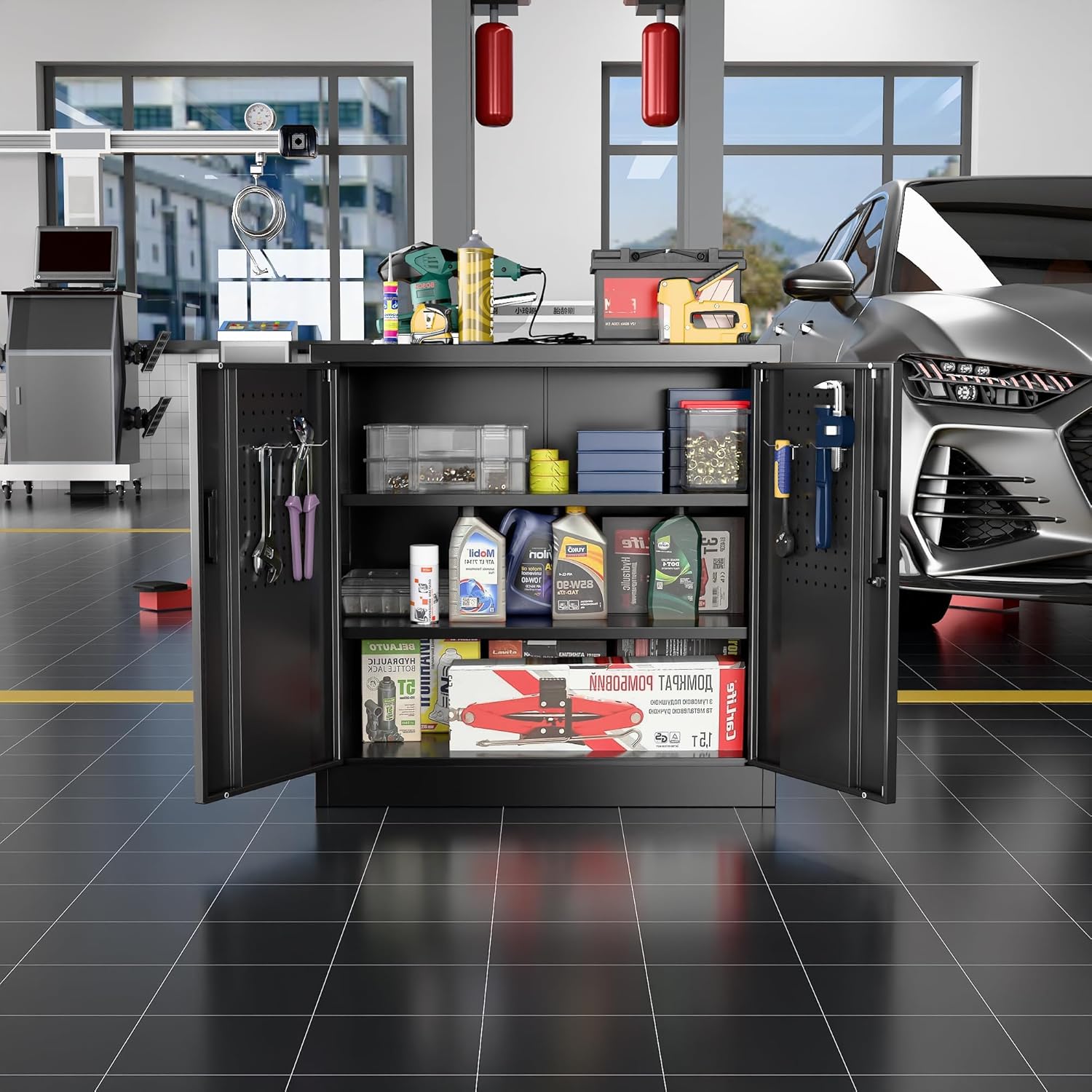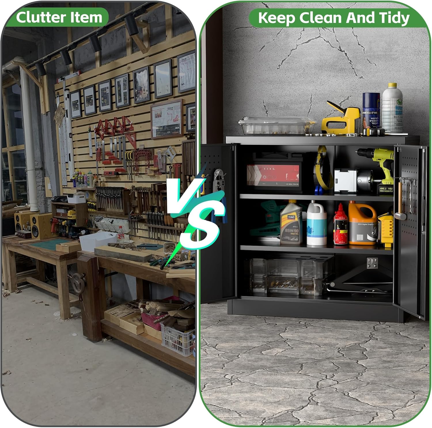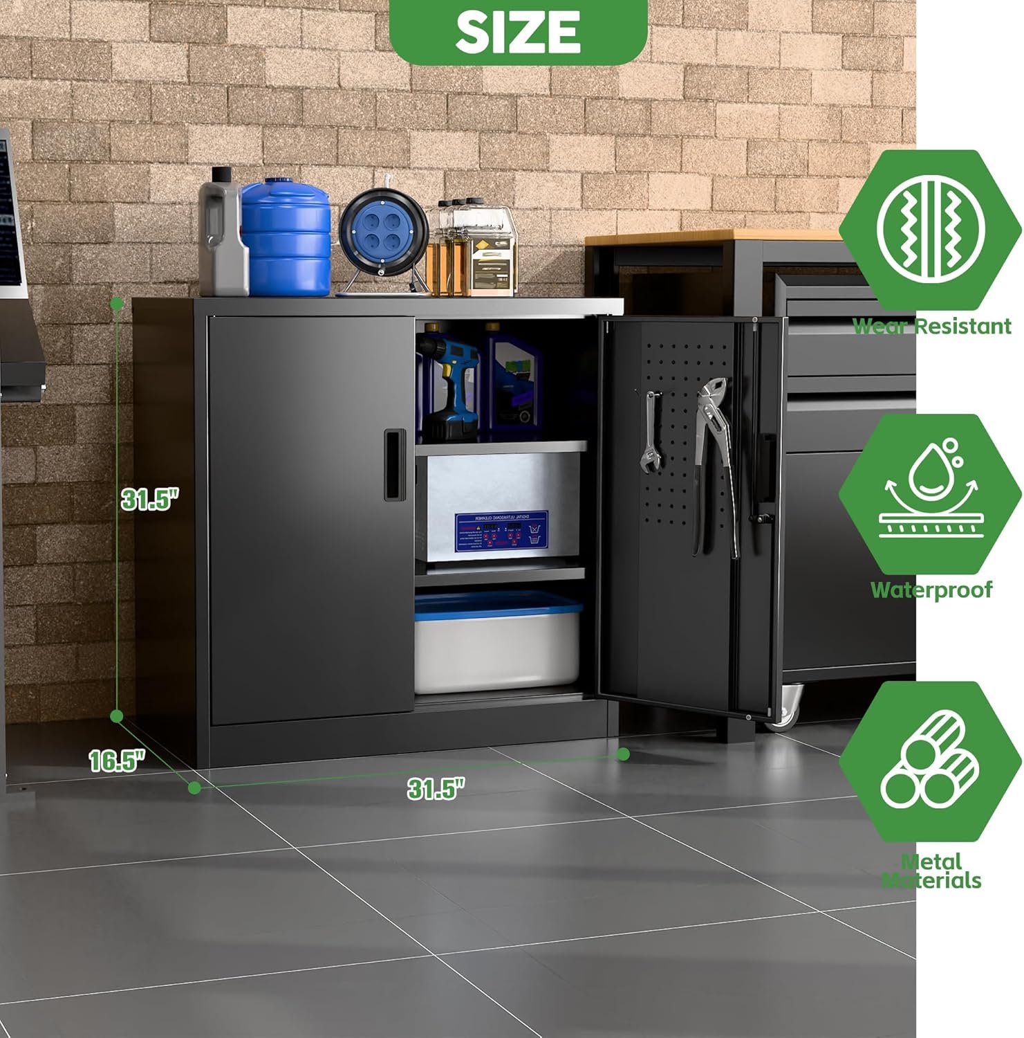 • Redesigned for Efficiency: Integrated Pegboard Doors + Free Hooks! "NEW UPGRADE: Double doors feature full pegboard panels and include four heavy-duty hooks. Instantly hang tools, cords, or accessories – maximizing every inch of space for a super-organized, ultra-convenient workspace."