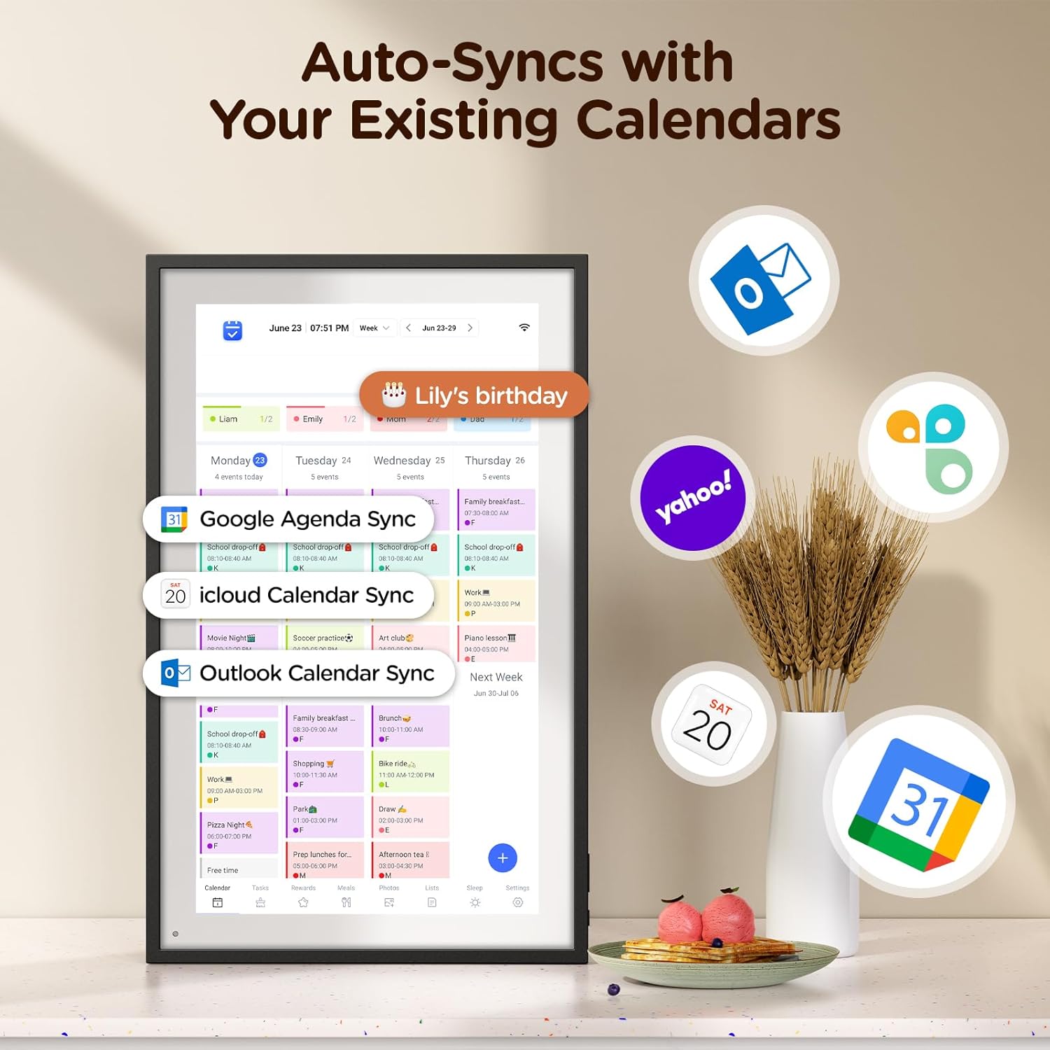 • Easy Sync, Zero Subscription: Easily sync through our mobile app Compatible with Various commonly used calendar apps like Google Calendar, iCloud, Outlook, Cozi, and Yahoo. Support bidirectional operation and realtime synchronization between device and mobile app. keep your family organized.
