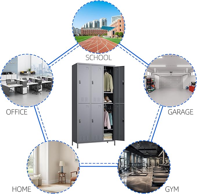 • 【Large Storage Capacity】6 doors metal lockers for employees with Lock 15.75"D x 35.43"W x 72"H. Equipped with 18 hooks,it can meet your needs for storing different sized items and meet most of your daily needs.Each metal locker is equipped with a combination lock, allowing you to use the locker without carrying a key.