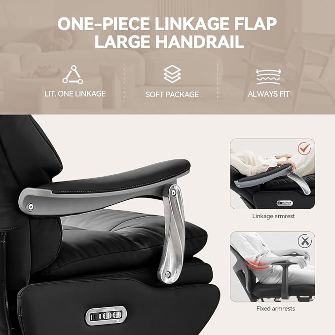 • Independent Backrest and Footrest Electric Adjustment: This electric reclining executive office chair with a footrest features a unique dual-motor system, allowing you to easily adjust the backrest and footrest angles independently using the control buttons. With a 160° big reclining backrest, you can find your perfect angle with a single press. Whether working, relaxing, sitting cross-legged, bending your knees, or reclining for a quick nap, this chair meets all your posture needs. It’s the perfect choice for a comfy computer chair or high-back home office desk chair.