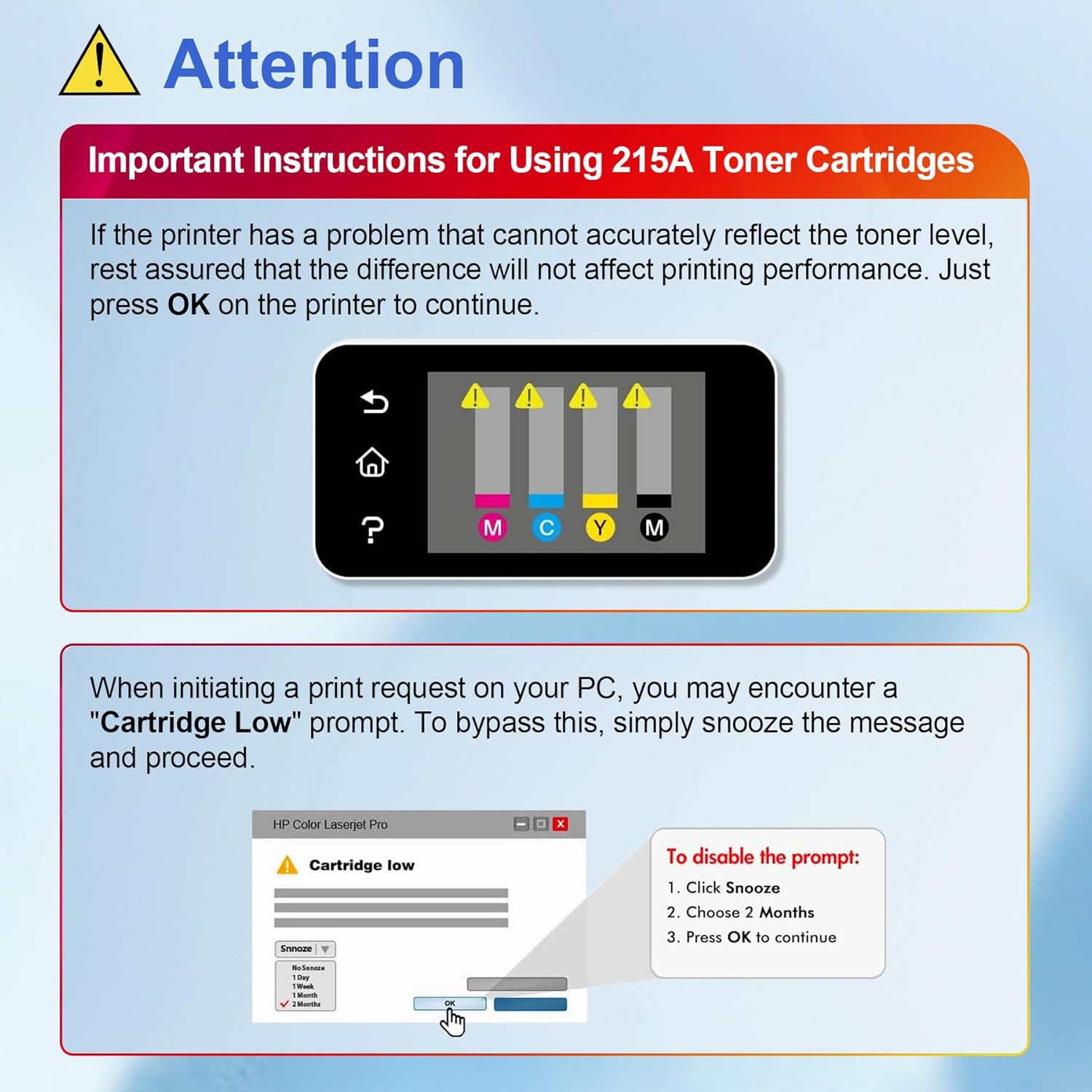 • HIGH PAGE YIELD: Up to 1050 pages for 215A toner cartridge black and 850 pages for per 215A color toner cartridge(Letter/A4, at 5% Coverage)