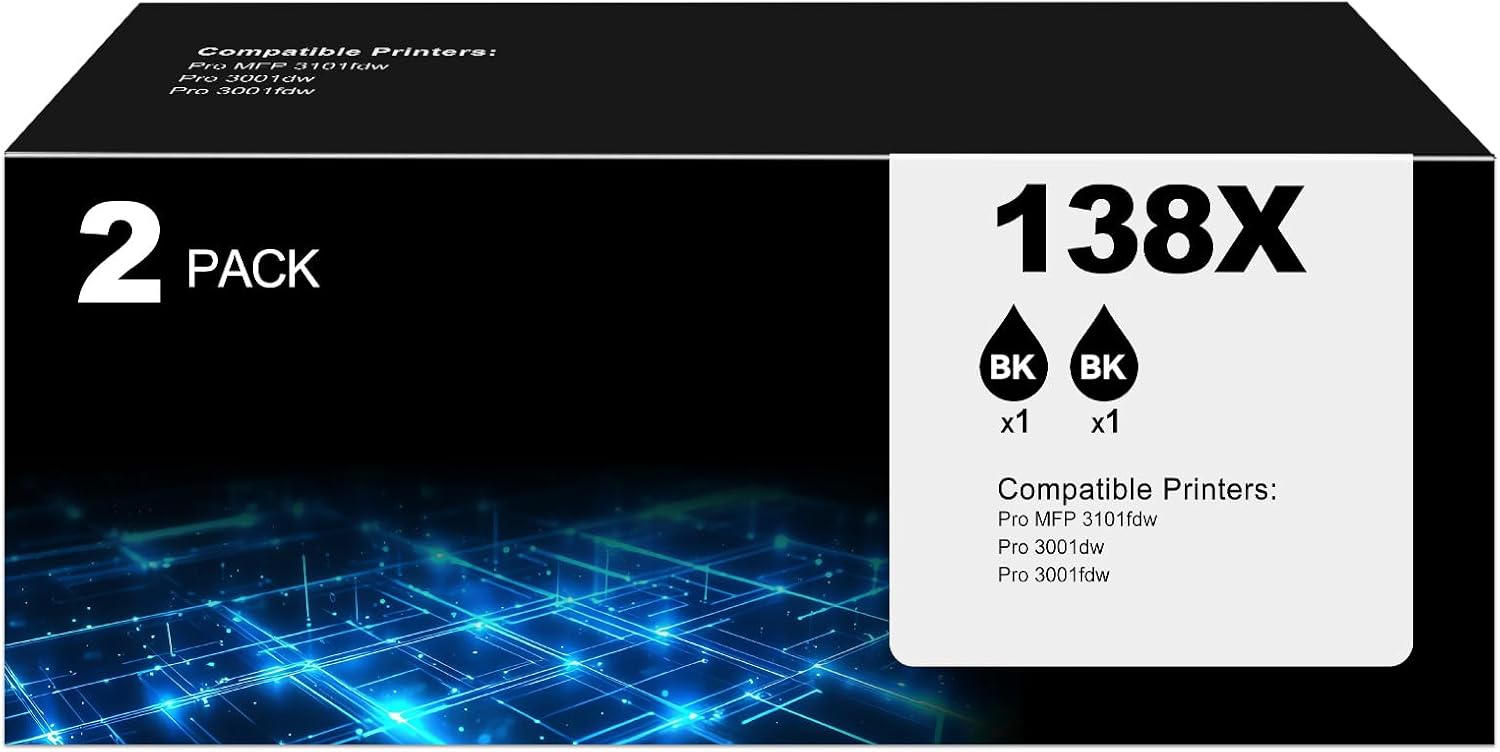 • Compatible for HP 138X Black Toner Cartridges 2 Pack Printer Model:for hp 138X black Toner Cartridges Compatible for hp color Laser pro mfp 3101fdw toner, color Laser pro 3001dw toner, Laser Pro MFP 3101sdw, color Laser pro 3001fdw toner