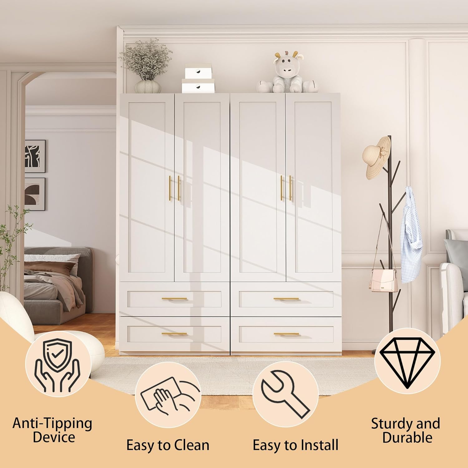 • Premium Materials: Crafted from high-quality engineered wood, the wardrobe with drawers and shelves offers lasting durability. The surface of the white closet with doors is specially treated to resist wear and scratches while being easy to clean, ensuring it stays looking great even with everyday use. For added safety and stability, the free standing closet with doors includes an anti-tip device—making it especially suitable for homes with children or pets.