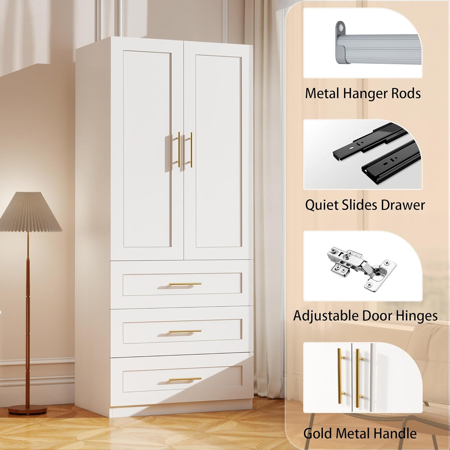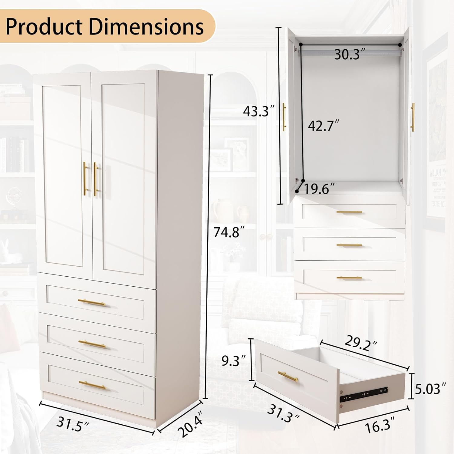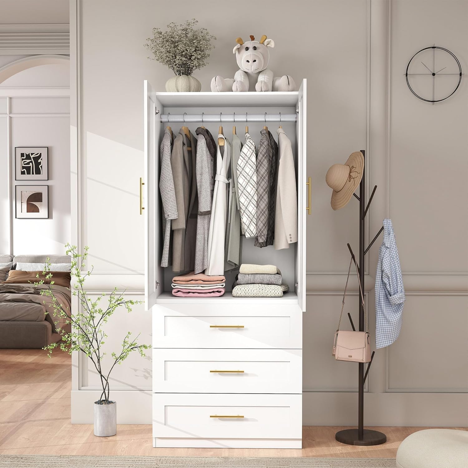 White Wardrobe with 2 Doors: 75" Tall Armoire Wardrobe Closet with 3 Drawers, Bedroom Closet Cabinet for Hanging Clothes, Wooden Storage Armoire with Shelves (Modern, 1)