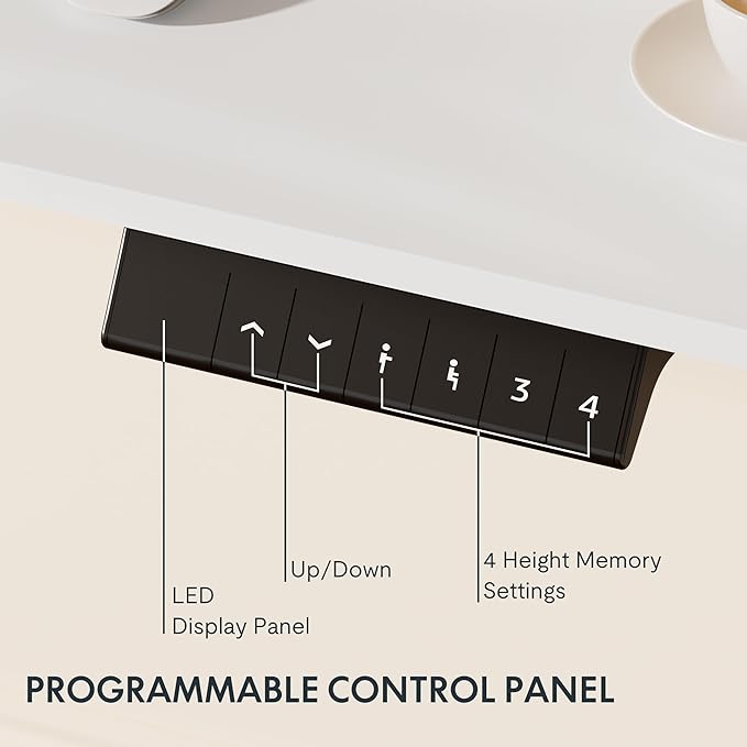 • 4 MEMORY BUTTONS: Easily switch between sitting and standing positions with our 6-button digital controller that features 4 programmable memory presets. The motorized height-adjustable system adjusts smoothly from 28.1” to 45.7”, and the motor runs quietly at less than 50 dB.