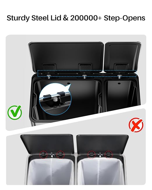 • Hands-Free Operation: Our kitchen garbage can features durable stainless steel pedals for hands-free trash disposal. The stainless steel foot pedal has a service life of over 200,000 times, that's more than 20 steps a day for 30 years