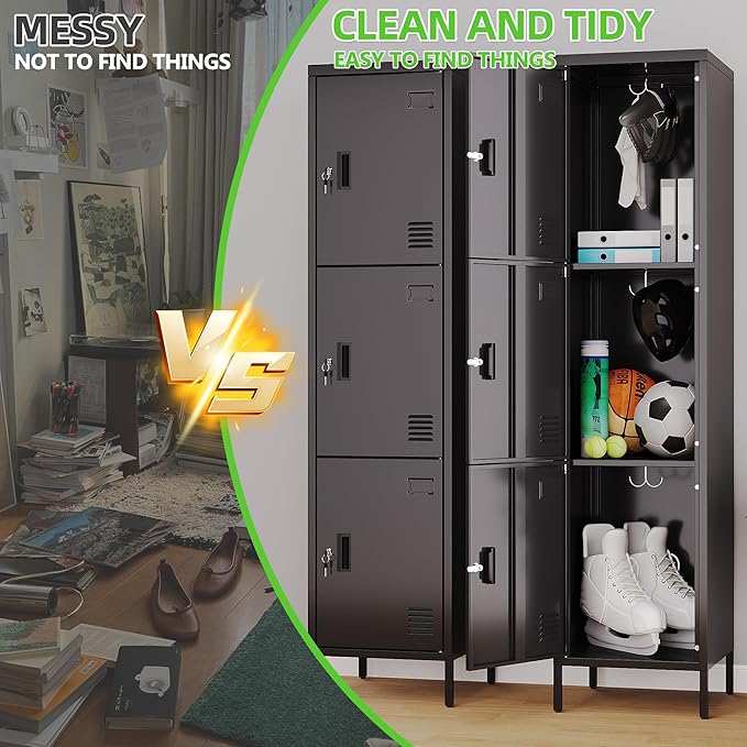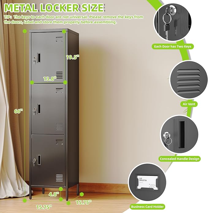 • Sleek Black Aesthetic:This 3 door metal storage locker in a stylish black color not only offers secure storage but also adds a modern touch to any home, office, or gym environment. With dimensions of 66.18"H×15.75"W×15.75"D, it provides ample space without taking up too much floor area.
