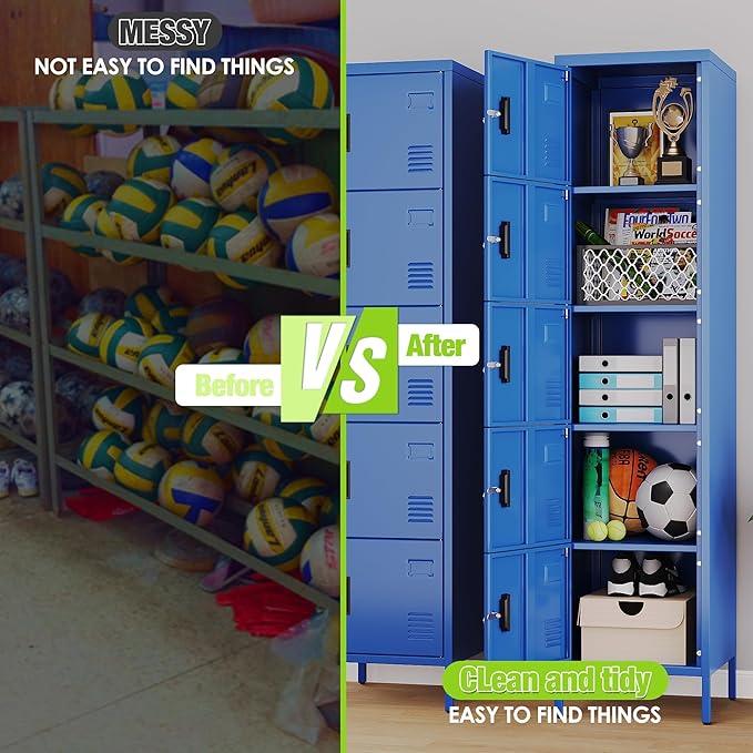 • Sleek Blue Aesthetic:This 5 door metal storage locker in a stylish blue color not only offers secure storage but also adds a modern touch to any home, office, or gym environment. With dimensions of 66.18"H×15.75"W×15.75"D, it provides ample space without taking up too much floor area.