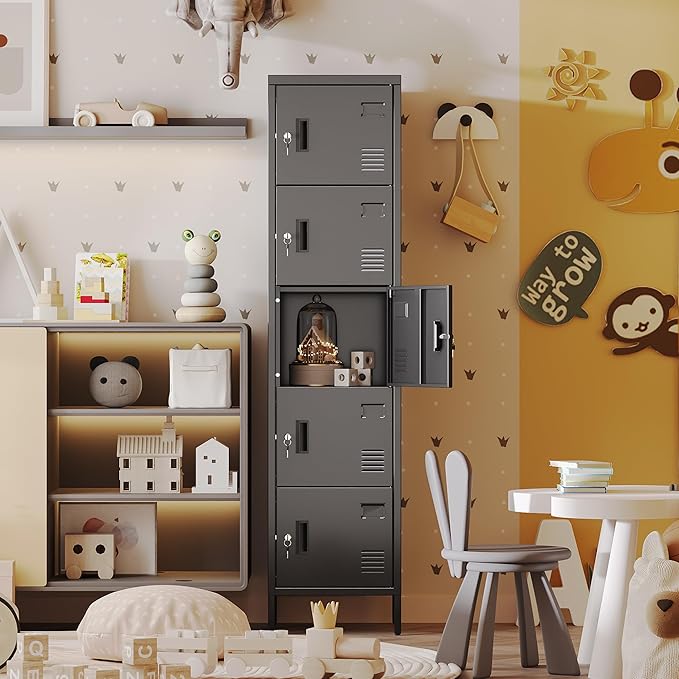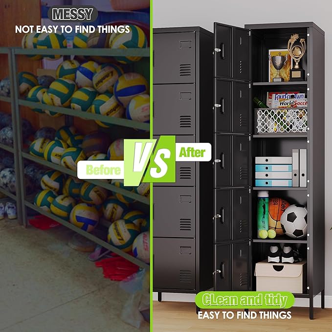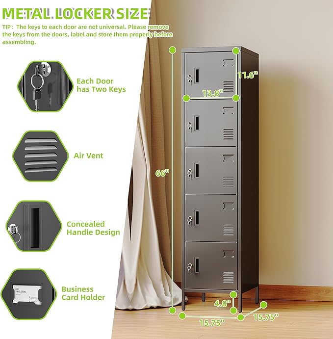• Sleek Black Aesthetic:This 5 door metal storage locker in a stylish black color not only offers secure storage but also adds a modern touch to any home, office, or gym environment. With dimensions of 66.18"H×15.75"W×15.75"D, it provides ample space without taking up too much floor area.