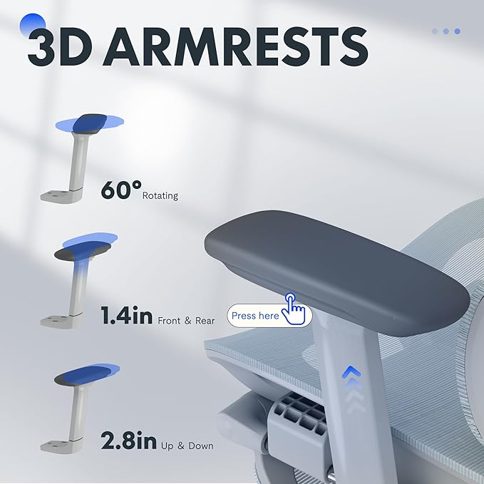 • 3D Armrests: Fully adjustable armrests (height, forward/back, and swivel) allow for precise positioning to reduce arm strain during extended use.
