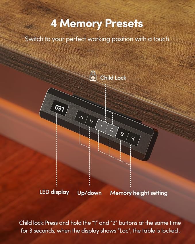 • 4 Memory Height Presets: The Fezibo Electric Standing desk features an intuitive LED controller for quiet operation. It allows you to save up to 4 custom height settings to seamlessly switch between your preferred heights, ensuring you have a focused, distraction-free workspace.