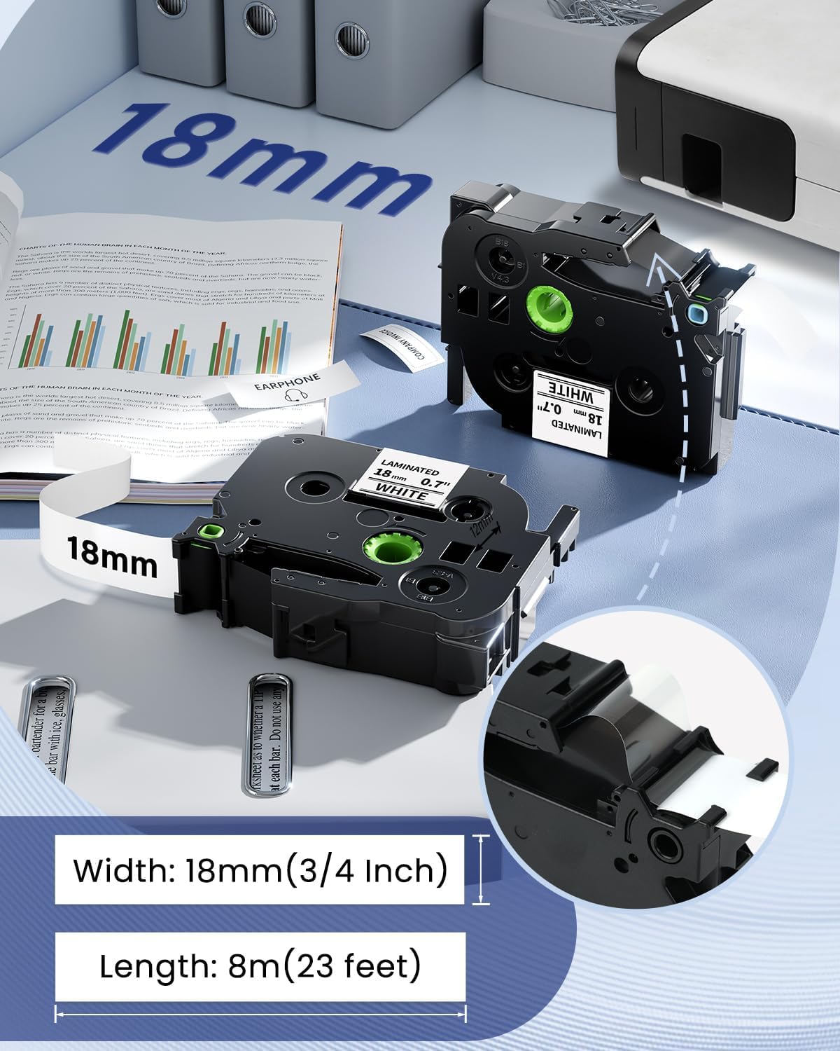 • Outstanding performance for indoor and outdoor use, all these label maker tape 18mm 0.7 white won't sumdge or smear when using, water and oil tolerant, abrasion, fade and temperature. Designed for smooth, flat surfaces like office paper, file folders and binders