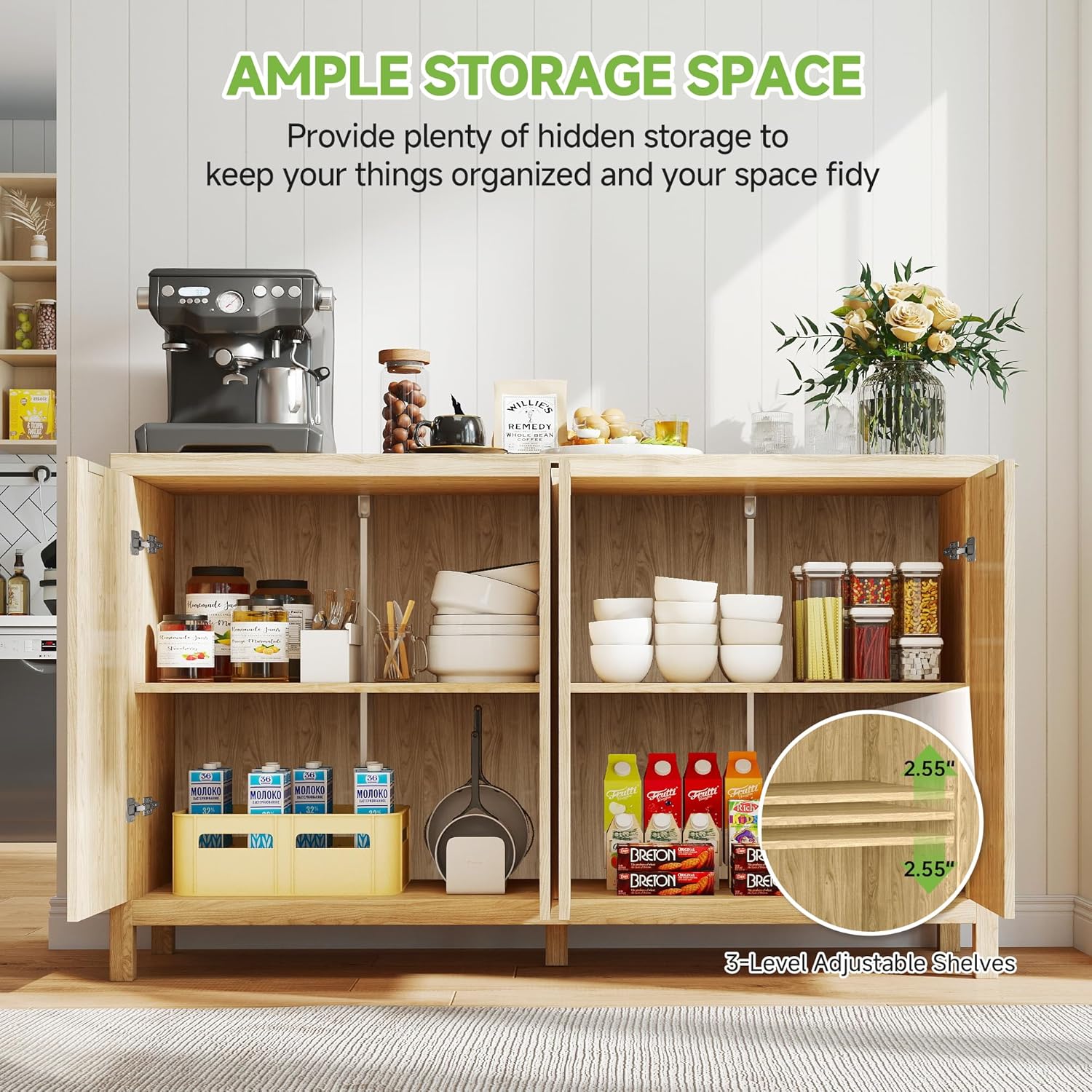Real Relax Fluted Sideboard Cabinet, 4-Door Sideboard Buffet Cabinet with Storage, 55" Large Modern Credenza Adjustable Shelves, Buffet Table for Dining Room, Kitchen, Living Room, Natural Oak
